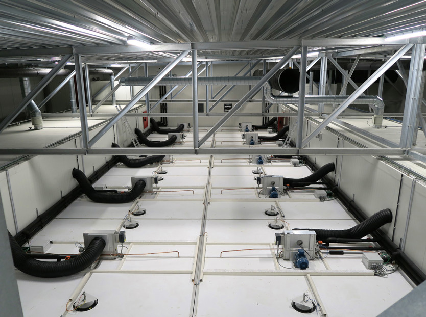 Certain HVAC systems constantly supply a fixed maximum air volume to the setter and hatcher room. This may seem like a good way to ensure proper climate control when, in fact, a lot of energy is wasted. As the air consumption of single-stage incubators – and incubator rooms – is variable, it is more energy- and cost-efficient to install a pressure-controlled HVAC system that brings in and conditions only the exact amount of air needed at a particular moment in time. Whenever there is an increase or decrease in air consumption, the pressure will respectively drop or rise. A pressure sensor records these fluctuations and adjusts the ventilator speed and airflow. The benefits are significant:Â
