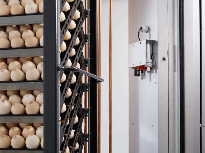 It is our objective to replicate this nest experience in the commercial incubator. The challenge here is to achieve a good uniform temperature on a much larger scale. This is done through a temperature-controlled constant airflow in and around the eggs.Â