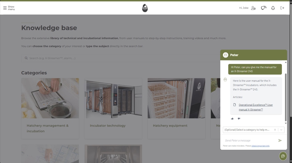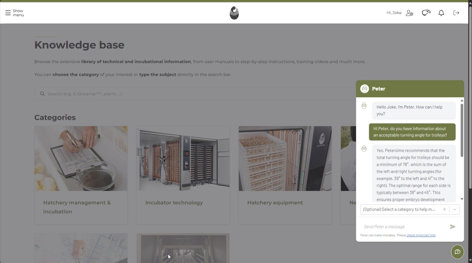 “At Petersime, we believe customer satisfaction comes from their overall experience with us, both face-to-face and online. In 2023, we launched MyPetersime, our customer portal aimed at offering a smooth digital experience for all our services and support. We recently improved the portal’s knowledge base by adding a new AI-powered chatbot to make things easier for our users,” explains Steven Lassuyt, Coordinator Helpdesk, Training & Documentation at Petersime. “The chatbot will help users navigate the knowledge base, ask questions and find information with ease.”