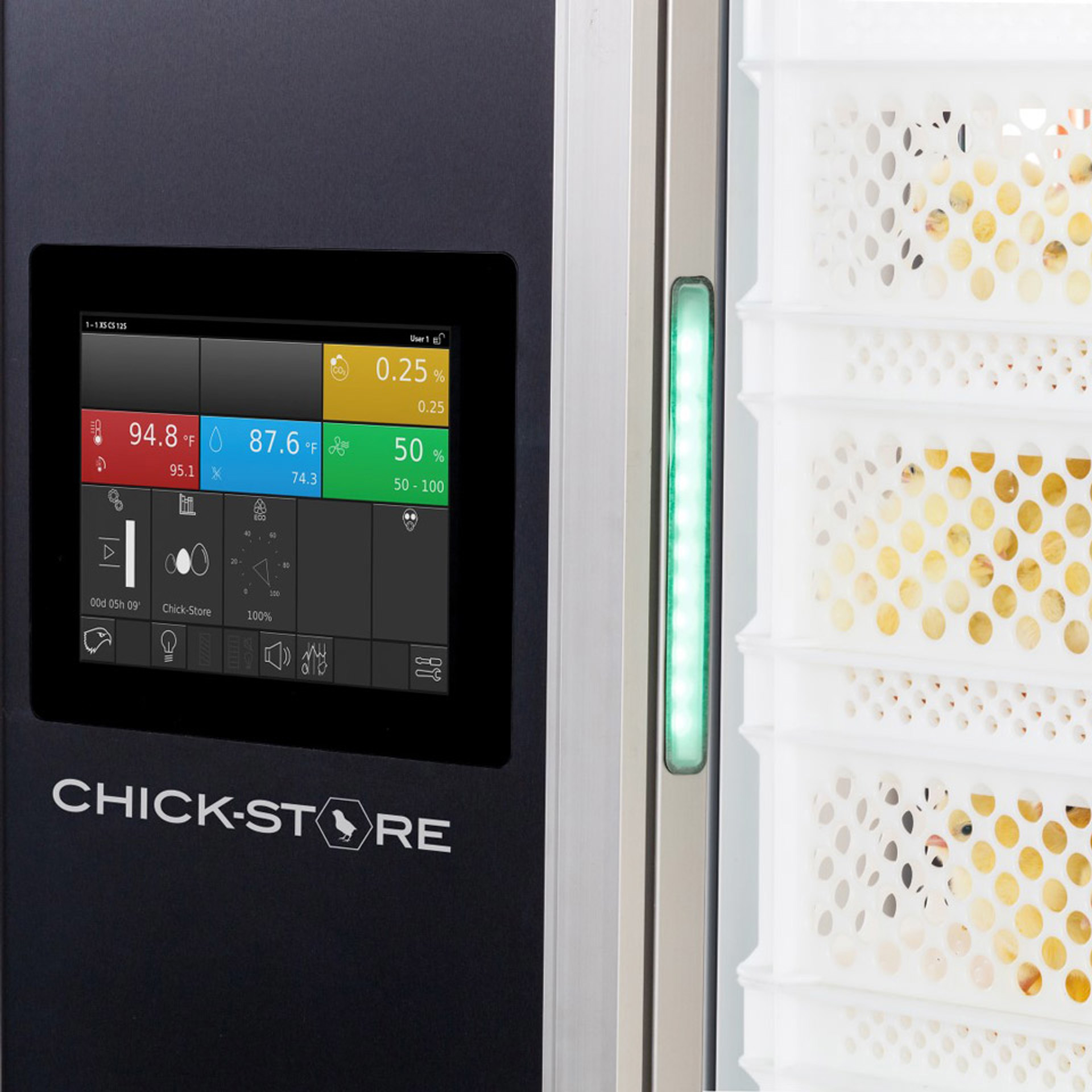 X-Streamer™ Chick-Store 内部采用柔和照明,对新生雏鸡具有舒缓效果,有助于节省宝贵的能源。为了让雏鸡为分发做好准备,照明系统可以逐渐改变灯光强度。这样可以避免从暗室突然变为强光环境,尽量减少在门打开时雏鸡的应激反应。